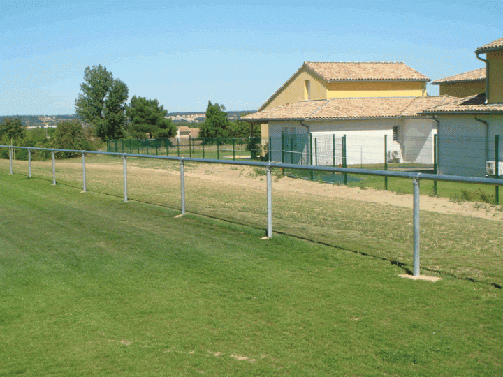 Poteaux équipés de coudes pour les angles et de tés pour l'assemblage linéaire entre lisses. Hauteur des poteaux 1,35 m soit 1,10 m hors sol.
